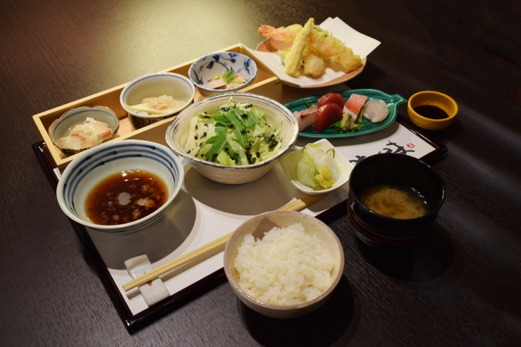 (お刺身、天ぷら、サラダ(ごまドレッシング)小鉢三種、ごはん、みそ汁つき)
